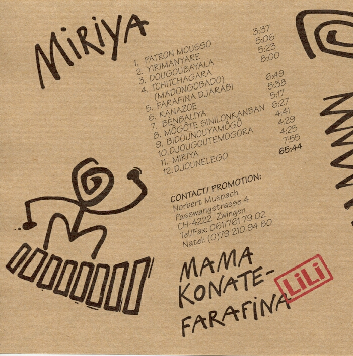 Doch hier trennten sich die Wege:Seine Band wollte «europäisierte» Weltmusikmachen,während Konaté nach Burkina Faso zurückging und dort eine Schule für Tanz und traditionelle Musik mitsamt dazugehörendem Bauernhof gründete.Jetzt meldet sich der Komponist des Rhythmus zurück mit einer neuen Band die den alten Namen trägt,und demonstriert Unterschiede:Während seine alte Band Farafina auf dem album «Nemako» nette ,aber verpoppte Afro-Musik zum besten gibt,inszeniert Konaté auf «Miriya» ein sprühendes musikalisches Feuerwerk:Rhythmen werden zu Melodien,Trommeln treiben sich gegensteitig zur Ekstase,und die Gesänge verstärken die treibende Kraft des Rhythmus.Konaté ist tatsächlich Afrikas bester Balafon-Spieler.
