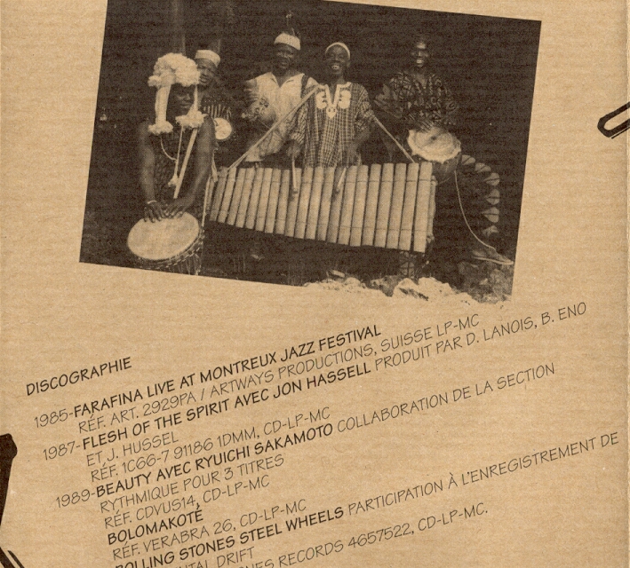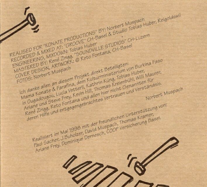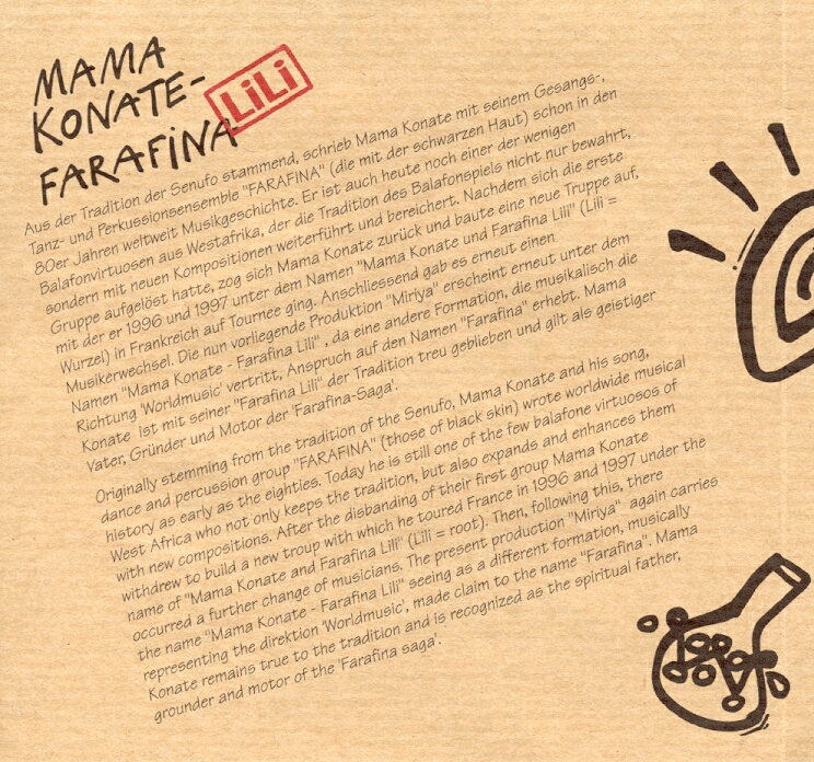 Bereits 1974 macht der heute 53 järhrige mit seiner Band Farafina (übersetzt «die mit der schwarzen Haut») mit Konzerten ausserhalb von Afrika auf sich aufmerksam.Schnell wurde Konaté zum Botschafter der afrikanischen Musik und zum Poiner der heute so modischen Weltmusik.Konzerte mit Ryuichy Sakamoto,Ronald Shannon Jackson und den Rolling Stones machten Konaté und Farafina zu Pop-Stars,die sich auf dem Höhepunkt ihrer Karriere befanden,als sie 1988 vor einem Millionen publikum zum 70.Geburstag von Nelson Mandela aufspielten.